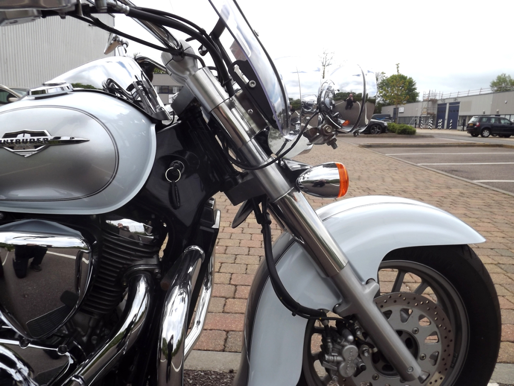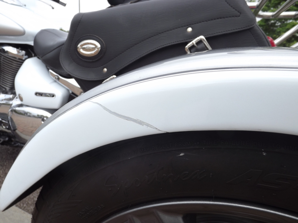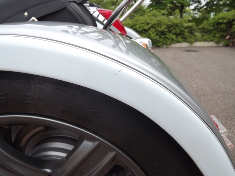 The mudguards are painted to match the bikes in white and silver with a double pinstripe (there are 2 scratched on the white paint on the nearside mudguard – shown in the photos). Wheels are 17″ titanium grey 5 spoke alloy wheels.